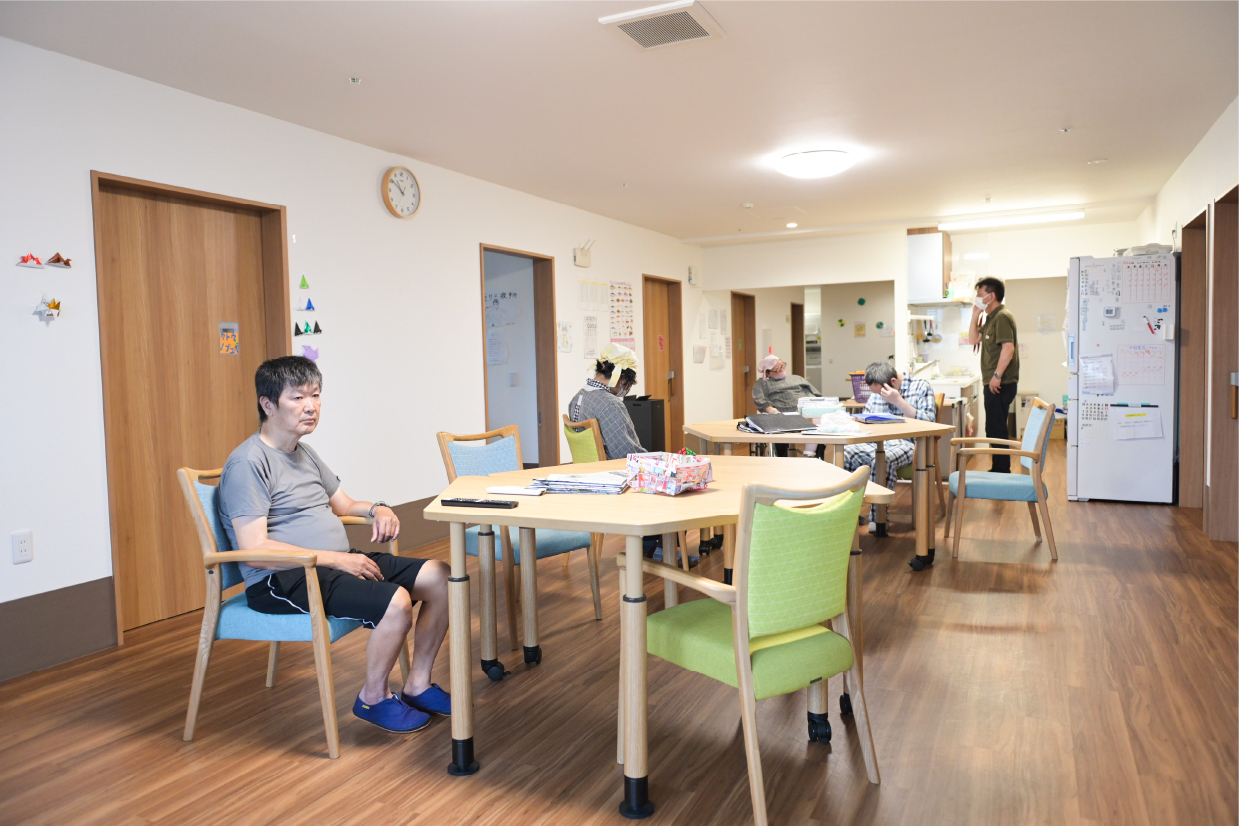 Each resident is different in age, level of disability, and strengths. Living under the same roof, it seems like they can use their strengths and enjoyable activities to support each other and take on roles. This is a home where disabled people who currently only need help cooking together and being looked after can push the wheelchairs of public residents, clean rooms, do laundry, and become supportive. When disabled people are not going out to do their work, they wave goodbye and say, "I'm going to call Grandma," or run up to the elderly in wheelchairs, creating a family-like atmosphere.